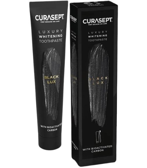 Pasta dentifricia sbiancante di colore nero con carbone bioattivo, idrossiapatite coniugata con chitosano, peroxidone e perossido di carbamide. Spazzolino con setole trattate al Carbone attivo. Gusto Intense mint.