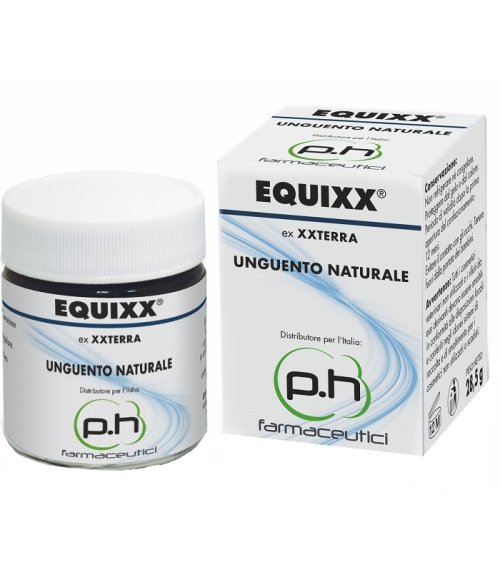 Equixx è una miscela di erbe e polvere di Bloodroot (Sanguinaria Canadensis) con cloruro di zinco, combinati e mescolati in una emulsione color marrone di facile utilizzo. La Bloodrot contiene alcaloidi come la Sanguinaria (componente principale), la Chelaritrina e Protopina.