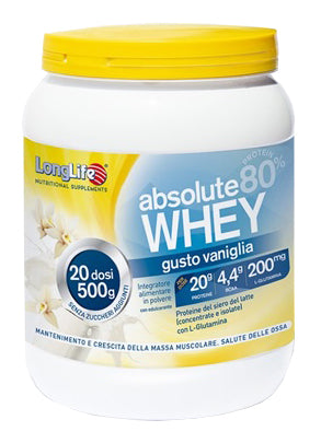 Integratore alimentare in polvere con edulcorante, a base di proteine del siero del latte (concentrate e isolate) con L-glutamina. Le proteine aiutano la salute delle ossa e contribuiscono alla crescita e al mantenimento della massa muscolare. Gusto vaniglia.