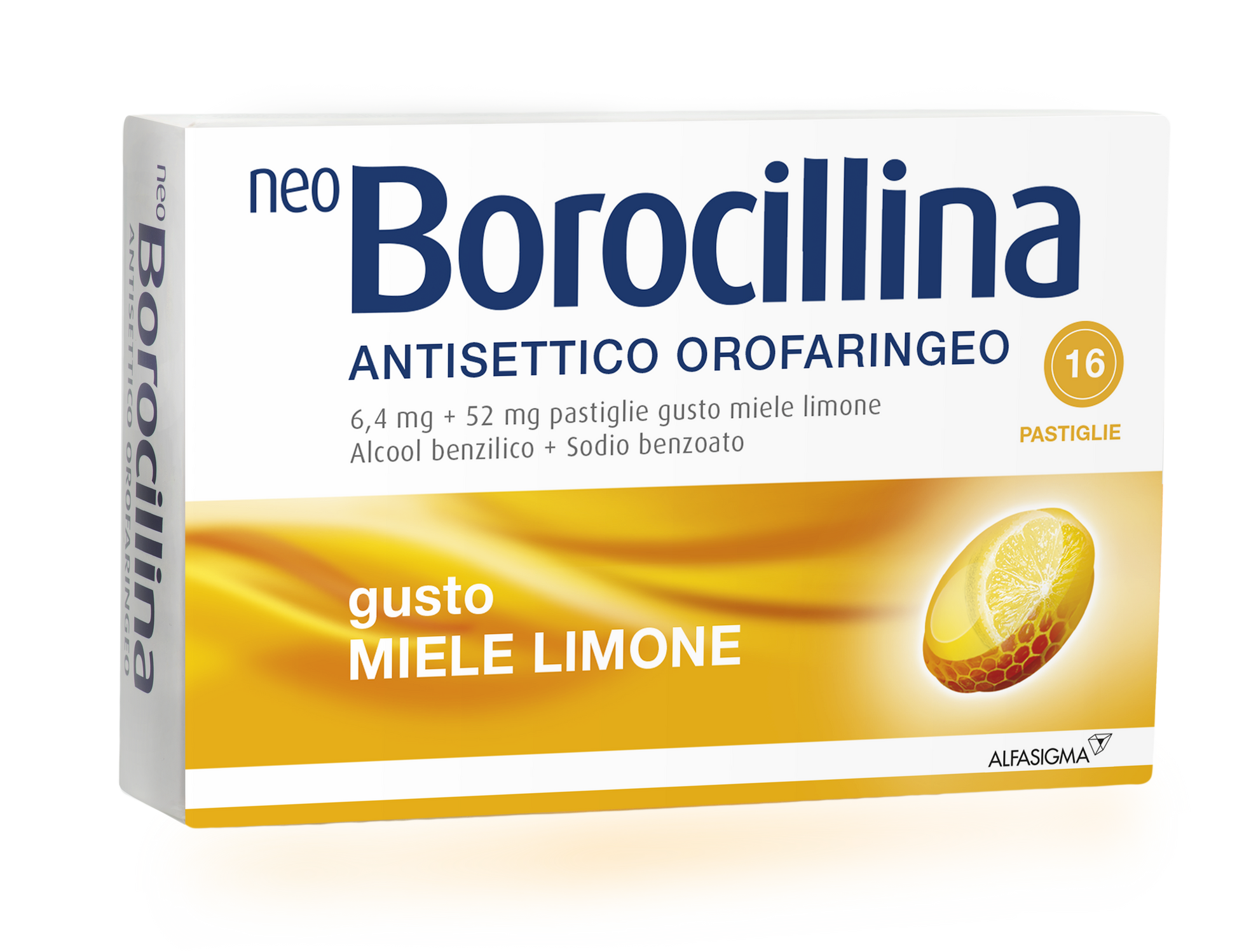 Neoborocillina ant or 6,4 mg + 52 mg pastiglie gusto limone, 16 pastiglie in blister al/pvc